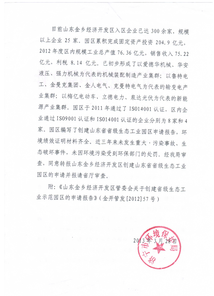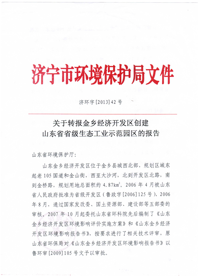 关于转报金乡经济开发区创建山东省省级生态工业示范园区的报告